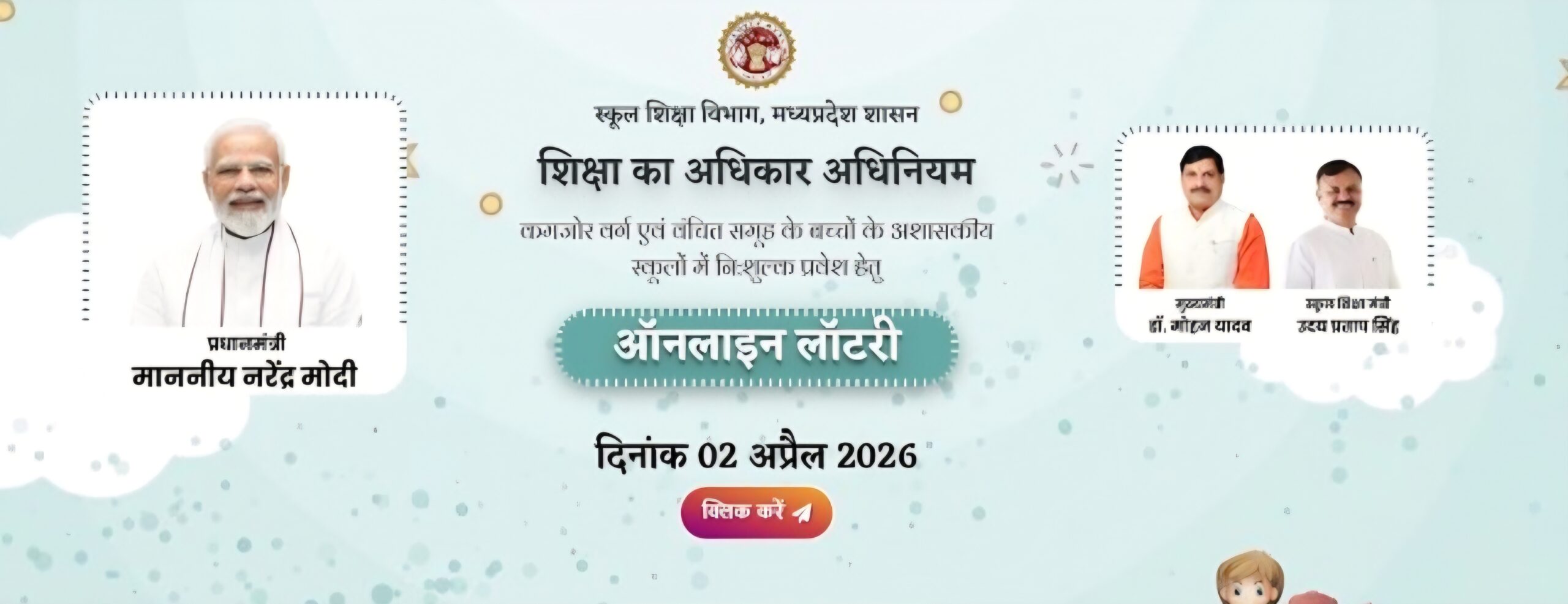 भोपाल, राज्य शिक्षा केन्द्र द्वारा गुरूवार 2 अप्रेल 2026 को दोपहर 2 बजे निःशुल्क एवं अनिवार्य बाल शिक्षा का अधिकार अधिनियम के तहत अशासकीय स्कूलों में निःशुल्क प्रवेश के लिये ऑनलाईन लॉटरी संचालित की जायेगी। जिसका सीधा प्रसारण राज्य शिक्षा केन्द्र के यूट्यूब चैनल https://youtube.com/live/ffjjYeJU3vo?feature=share पर किया जायेगा।