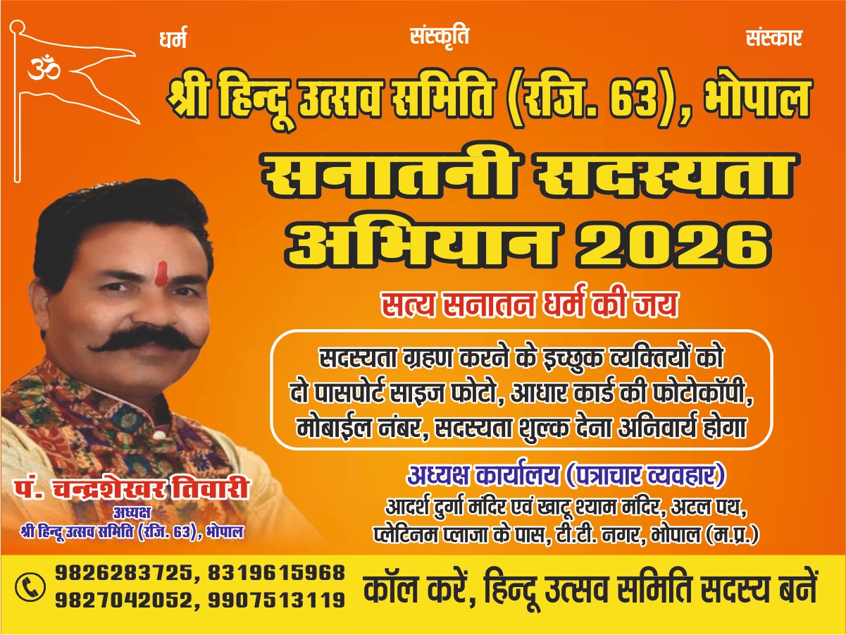 नगर में सनातन संस्कृति, परंपरा और हिंदू उत्सवों के संरक्षण एवं संवर्धन के उद्देश्य से सक्रिय श्री हिंदू उत्सव समिति (रजि 63) भोपाल द्वारा एक भव्य सनातनी सदस्यता अभियान का आयोजन किया जा रहा है। समिति के अध्यक्ष चंद्रशेखर तिवारी ने बताया यह अभियान आगामी 2 फरवरी (सोमवार) को प्रातः 11:00 बजे से दुर्गा मंदिर, पटेल नगर भारत टॉकीज परिसर में विधिवत रूप से शुभारंभ होगा।