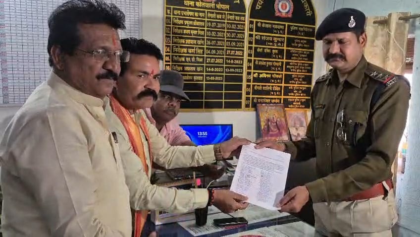 भोपाल, श्री हिंदू उत्सव समिति के अध्यक्ष व पदाधिकारी व व्यापारियों के साथ मिलकर थाना प्रभारी कोतवाली श्री कुशवाहा जी को सोपा ज्ञापन जो महिलाएं मांस फेकती है उन महिलाओं के खिलाफ की जाए कड़ी कार्रवाई किसी का भी धर्म धर्म भ्रष्ट करने की अनुमति किसी को भी प्रदान नहीं की जाए.