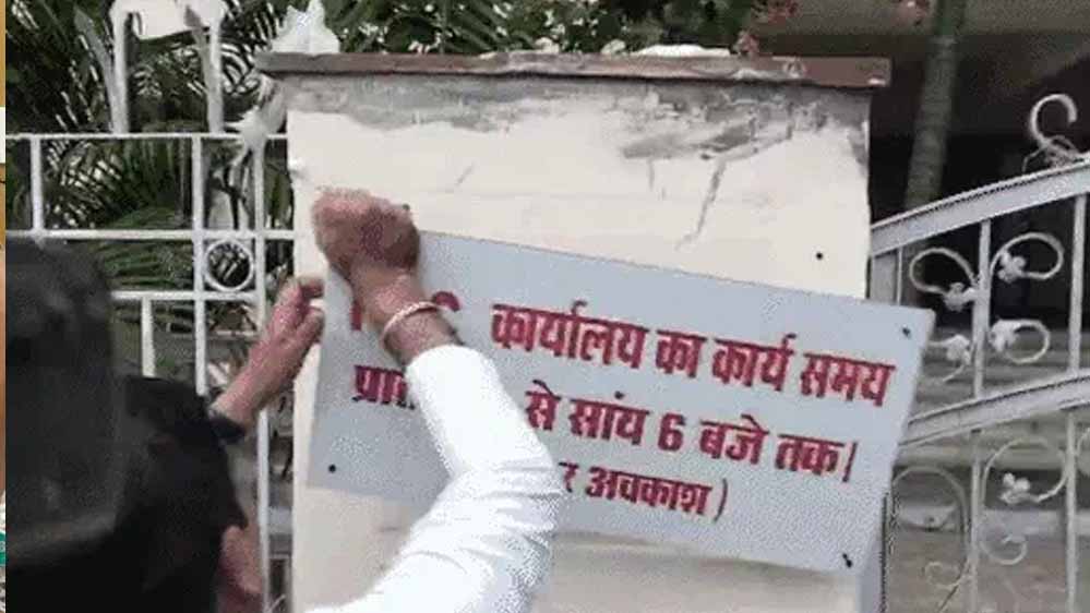 दरअसल, गुरुवार सुबह जब लोग भोपाल स्थित मध्य प्रदेश कांग्रेस कमेटी के कार्यालय पहुंचे तो गेट पर एक बोर्ड लगा दिखा. जिसपर लिखा था- ''पीसीसी कार्यालय के कार्य का समय सुबह 11 बजे से शाम 6 बजे तक है और रविवार अवकाश रहेगा.'' इस बोर्ड की तस्वीरें जैसे ही वायरल हुई कांग्रेस नेता अमित शर्मा कांग्रेस कार्यालय पहुंचे और बोर्ड को हटा दिया.