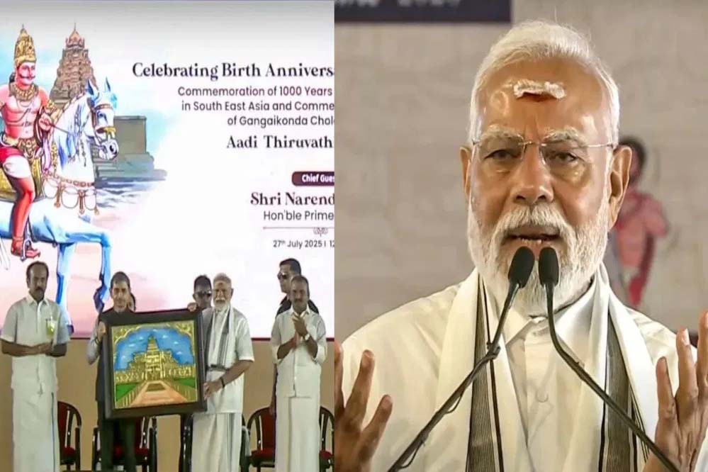 प्रधानमंत्री नरेंद्र मोदी ने गंगईकोंडा चोलपुरम मंदिर में महान चोल सम्राट राजेंद्र चोल प्रथम की जयंती के अवसर पर आयोजित समारोह को संबोधित किया। इस दौरान उन्होंने कहा कि जब वह ‘ॐ नमः शिवाय’ सुनते हैं तो रोंगटे खड़े हो जाते हैं। पीएम मोदी ने कहा, 'एक प्रकार से ये राज राजा की श्रद्धा भूमि है और आज इलैयाराजा ने जिस प्रकार हम सभी को शिवभक्ति में डुबो दिया, क्या अद्भुत वातावरण था। मैं काशी का सांसद हूं, जब मैं ॐ नमः शिवाय सुनता हूं तो मेरे रोंगटे खड़े हो जाते हैं।’